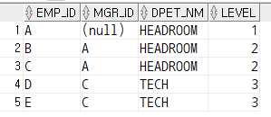 SELECT EMP_ID, MGR_ID, DPET_NM, LEVEL