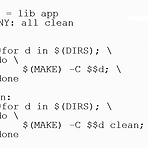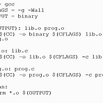 Makefiile의 예 binary라는 파일이 lib.o와 prog.o로 링크해서 생성한다 할때, binary: lib.o prog.o gcc -o binary -g -Wall lib.o prog.o lib.o: lib.c gcc -o lib.o -g -Wall -c lib.c prog.o: prog.c gcc -o prog.o -g -Wall -c prog.c clean: rm *.o binary binary라는 것이 여러번 사용되고 gcc -g -Wall이 여러번 사용될때, 매크로를 사용하면 된다. CFLAGS라는 매크로를 사용하면 여러번 -g -Wall을 쓰지 않아도 편하게 컴파일가능하다. %.o: %.c (%는 현재 디렉토리에 존재하는 어떠한 c파일 o파일이 될수가 있다.) 맨 아래 clean은 ..